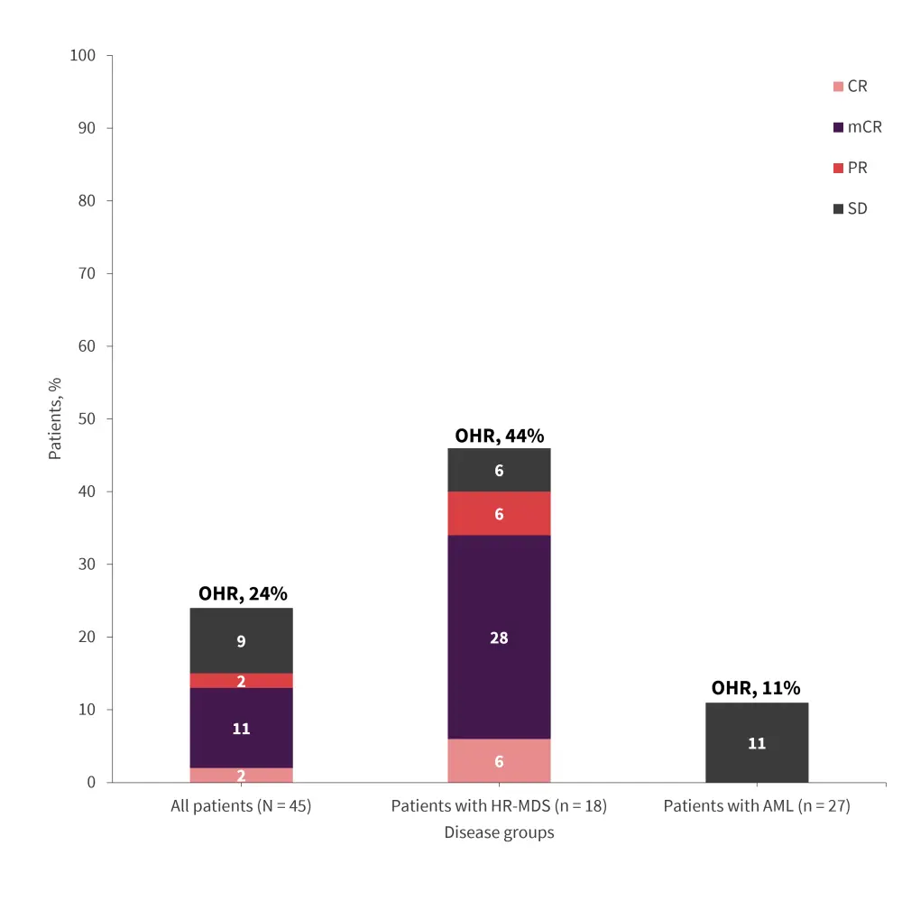 AML, acute myeloid leukemia; CR, complete remission; HR-MDS, higher-risk myelodysplastic syndromes; mCR, marrow CR; OHR, overall hematological response; PR, partial remission; SD, stable disease.