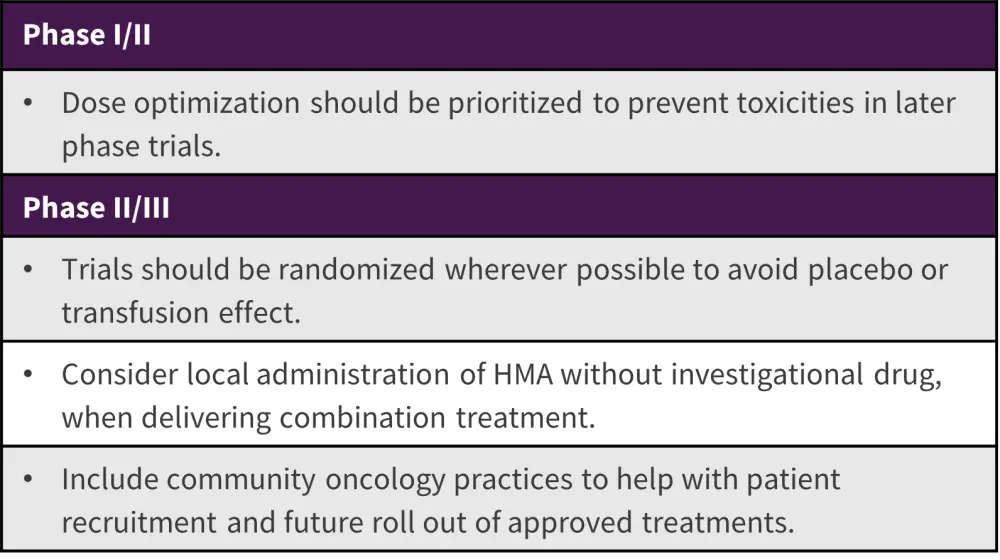 Sekeres et al.1 recently published expert recommendations for improving clinical trial design and endpoints to facilitate the development of novel therapies in MDS in Clinical Cancer Research. The MDS Hub is pleased to summarize the recommendations below.