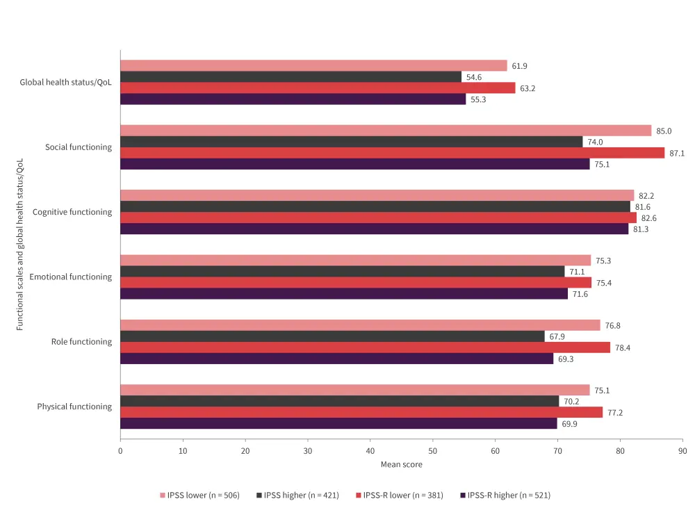 Figure 2. EORTC QLQ-C30 functional scales and global health status/QoL scores according to IPSS and IPSS-R in newly diagnosed patients with MDS*