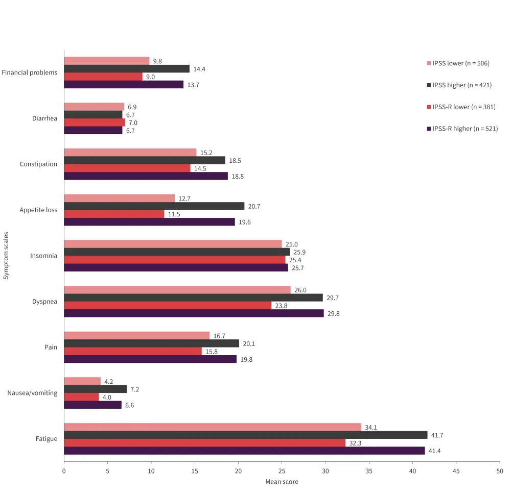 Figure 3. EORTC QLQ-C30 symptom scales/items scores according to IPSS and IPSS-R in newly diagnosed patients with MDS*