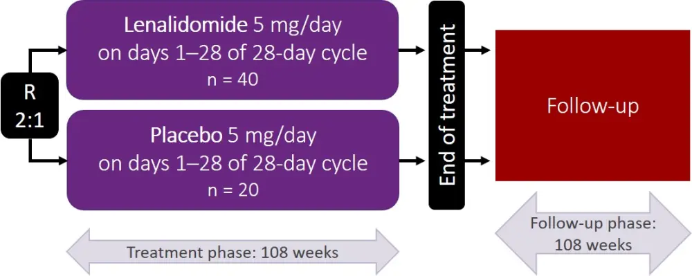 There were nine deaths in total, none related to study treatment, and acute myeloid leukemia was diagnosed in three patients, of which two (5%) were in the lenalidomide arm and one (5%) in the placebo arm.