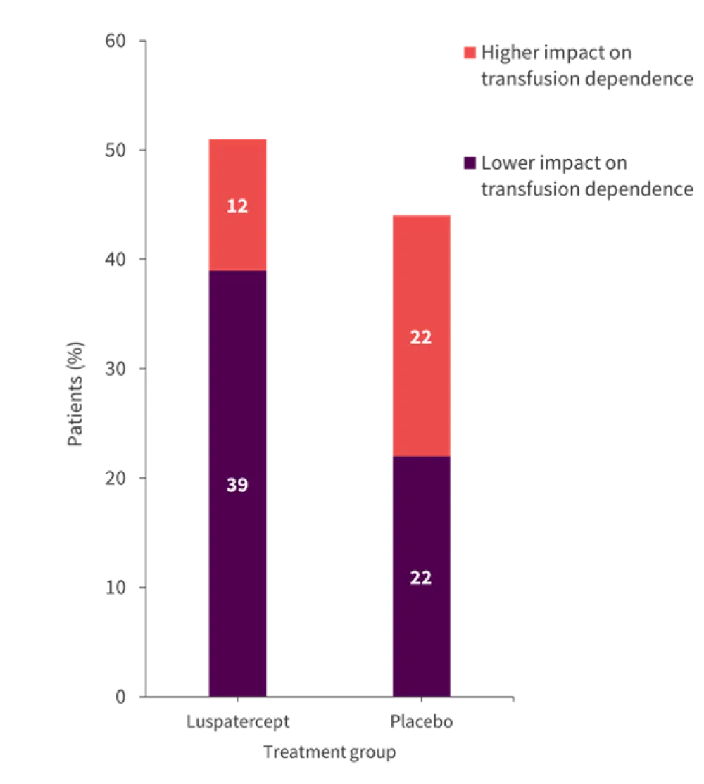 In contrast, 12% of patients in the luspatercept group reported transfusion dependence having more of an impact compared with 22% of patients in the placebo group. These results are shown in Figure 1.