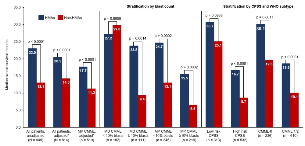 Multivariate analysis also showed a significant survival, TTNT, and TTAML benefit for patients with ≥ 10% blasts or WHO subtype CMML-1/2 who received HMAs compared to those who received hydroxyurea or intensive chemotherapy. However, OS was similar across treatment types for patients with myelodysplastic CMML, < 10% blasts, or WHO subtype CMML-0. Furthermore, patients treated with HMAs had: