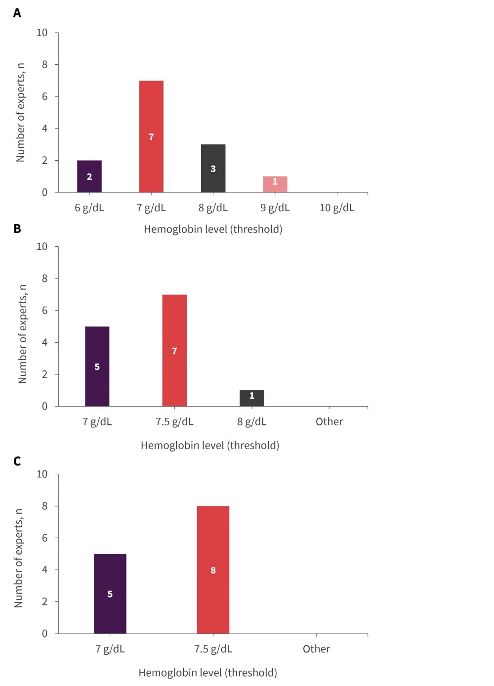 Figure 1. Hemoglobin level threshold for transfusion assessment accepted by the expert panel: A Round 1; B Round 2; C Round 3*