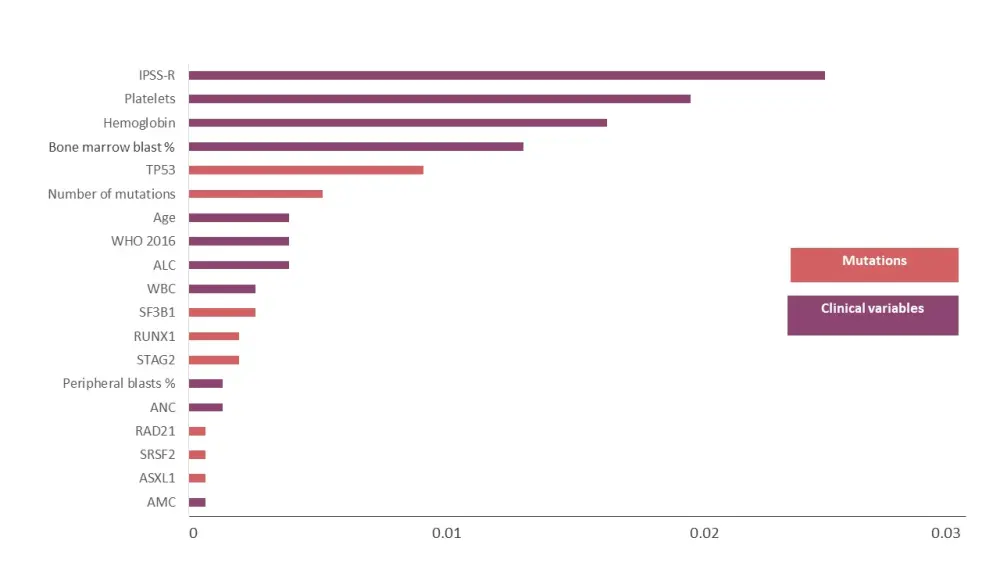 A cohort study with a training cohort of 1,471 patients (Cleveland Clinic, n = 528; and Munich Leukemia, n = 943) with MDS, including their comprehensively annotated clinical and molecular data, analyzed using machine learning technique. A random survival algorithm was used to build a prognostic model, and validated using external cohorts (Moffitt Cancer, S1117, and transplant cohort).