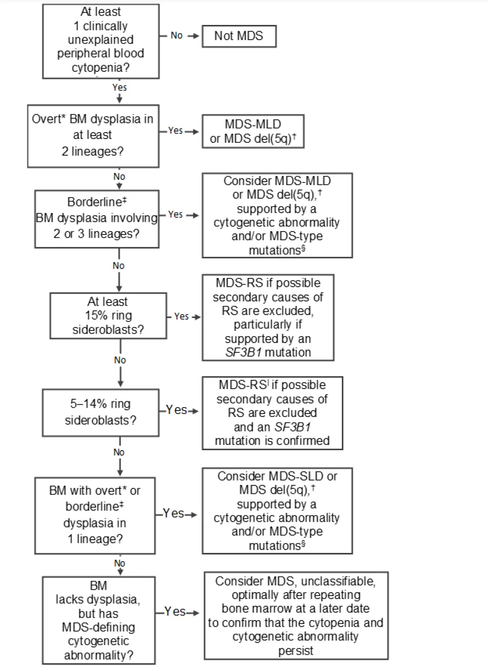 Due to the myriad of nonneoplastic causes of cytopenia, the differential diagnosis of MDS often requires interval re-biopsy to enable final confirmation and subsequent treatment planning. MDS evaluation requires integration of peripheral blood findings, bone marrow assessment, flow cytometry, cytogenetics, and molecular genetic studies, which can be difficult to consolidate. A diagnostic algorithm to assist with the classification of low-grade MDS on the basis of morphology and genetic testing results, based on the 2015 World Health Organization (WHO) classification of myelodysplastic syndromes, can be observed in Figure 1.