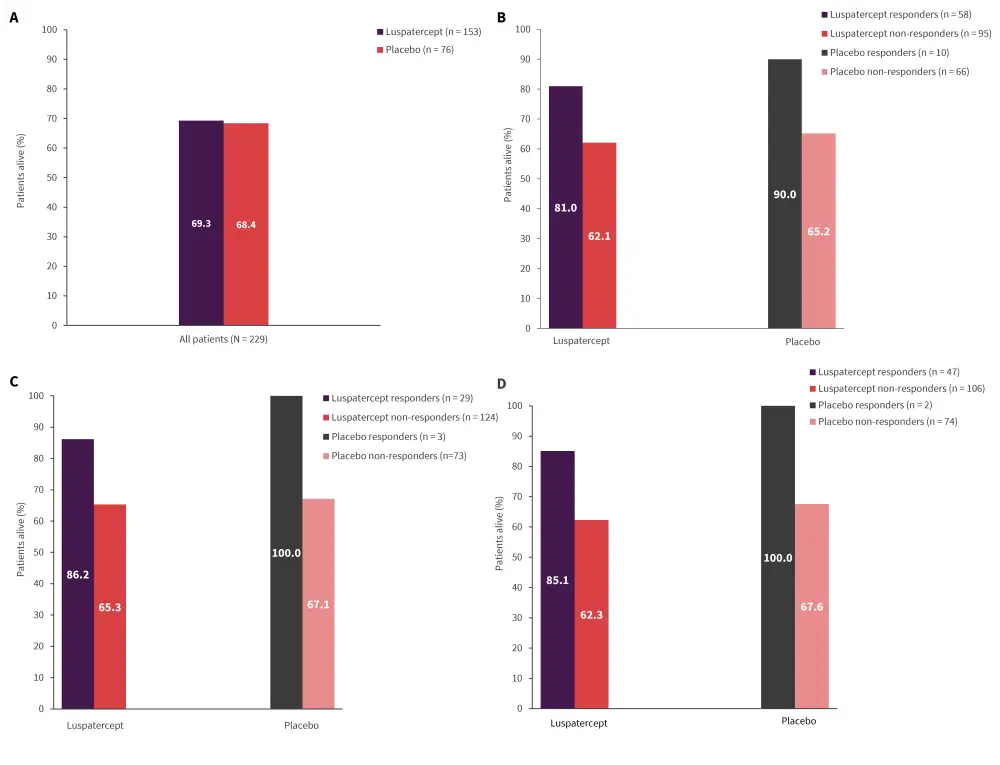 Response to luspatercept during Weeks 1–24 was associated with longer overall survival in the luspatercept arm (Figure 3).
