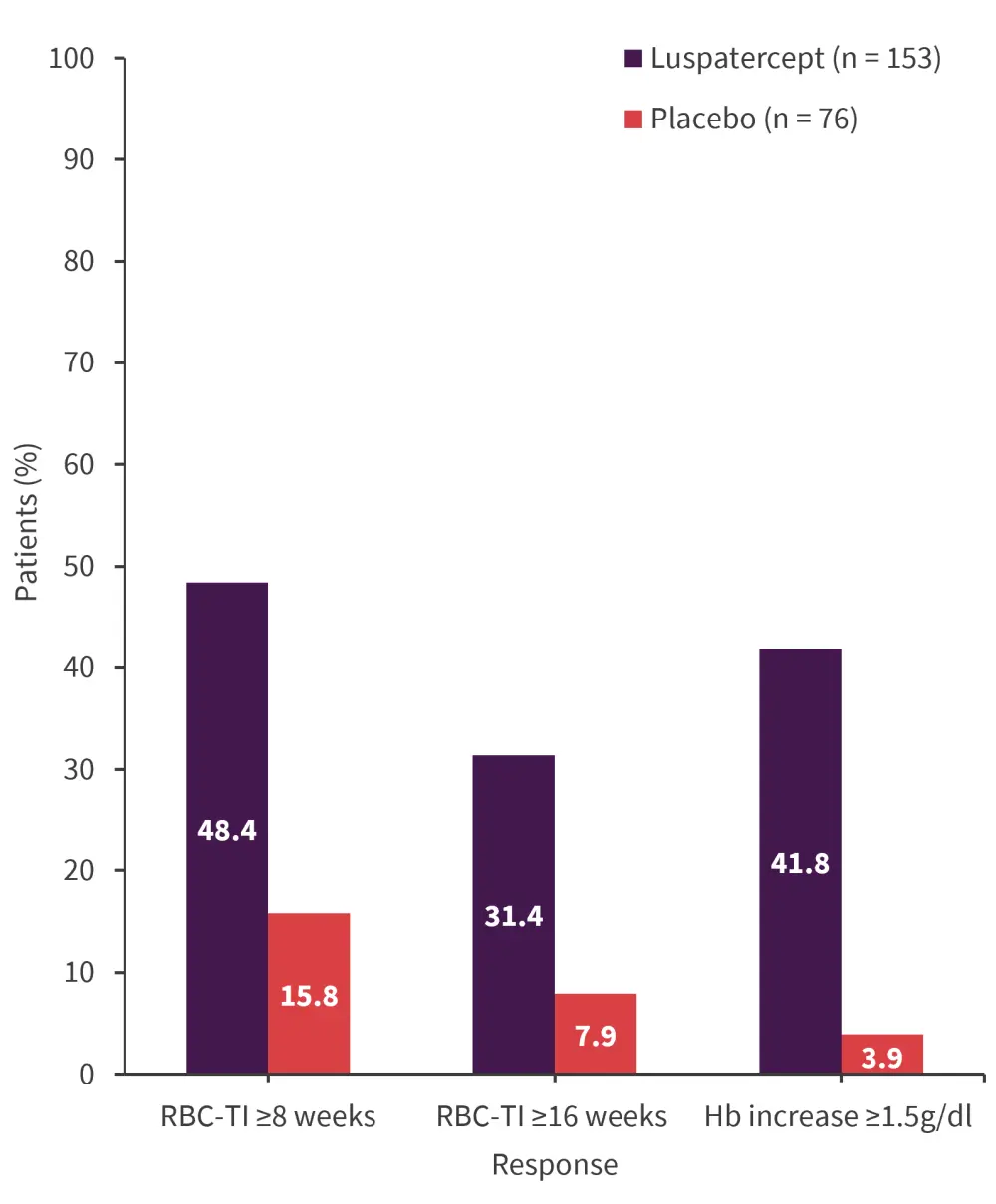 At the long-term follow-up data cutoff, red blood cell transfusion independence and an increase in hemoglobin level were experienced by a higher proportion of patients in the luspatercept arm vs placebo (Figure 1).