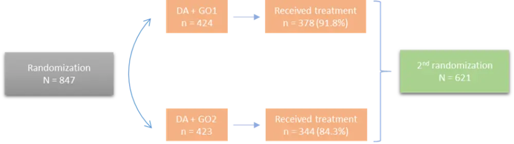 A total of 847 patients were randomized (see Figure 1). Following the first treatment course with either DAGO1 or DAGO2, patients were re-randomized to intensified treatment arms to demonstrate if patients who were not in complete remission (CR), or those who were in CR with MRD positivity, would benefit from this approach. However, the 2nd randomization was not a subject for this talk.